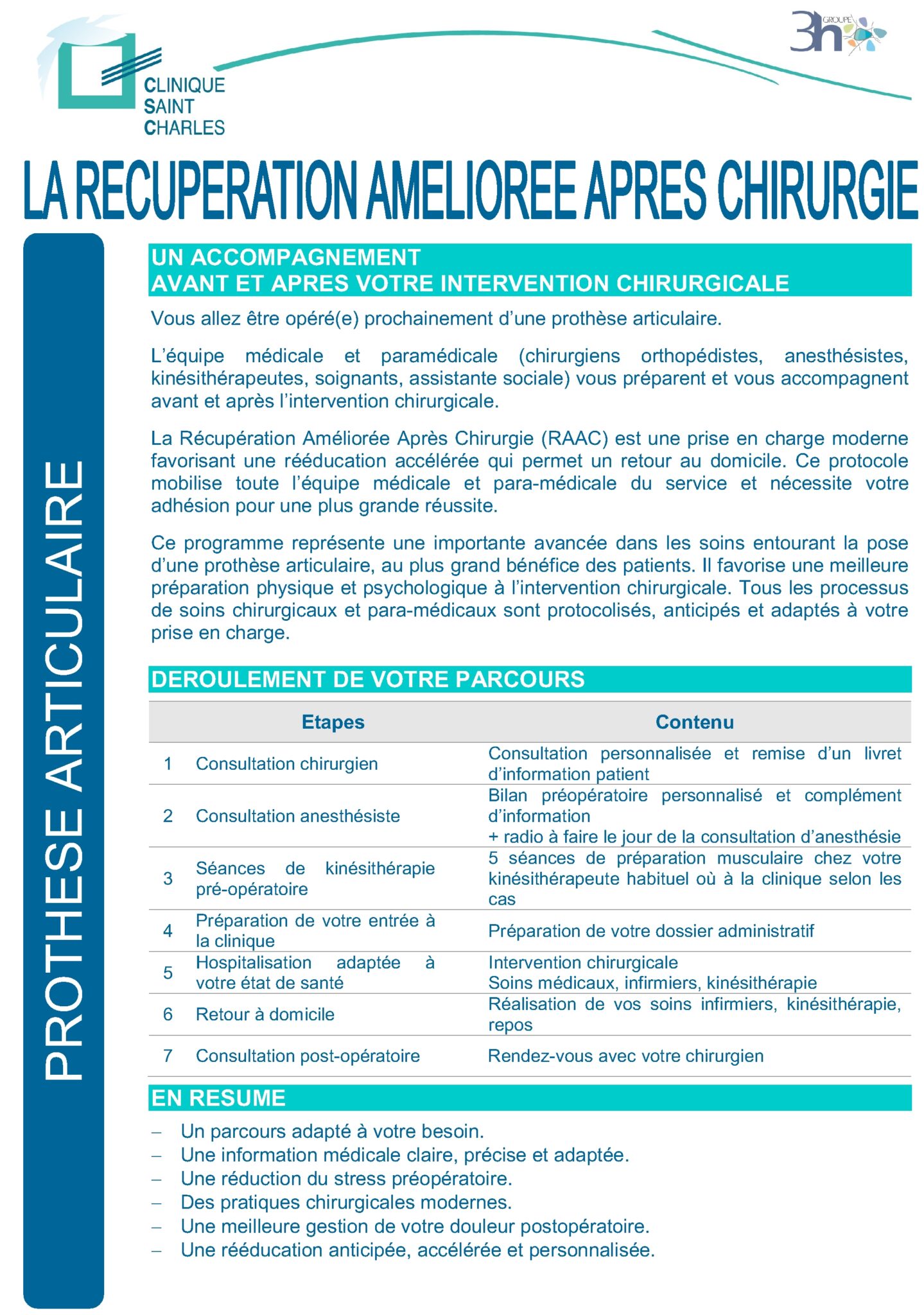 La Clinique Saint Charles a mis en place, depuis 2017, la Récupération Améliorée Après Chirurgie ou RAAC "orthopédie".